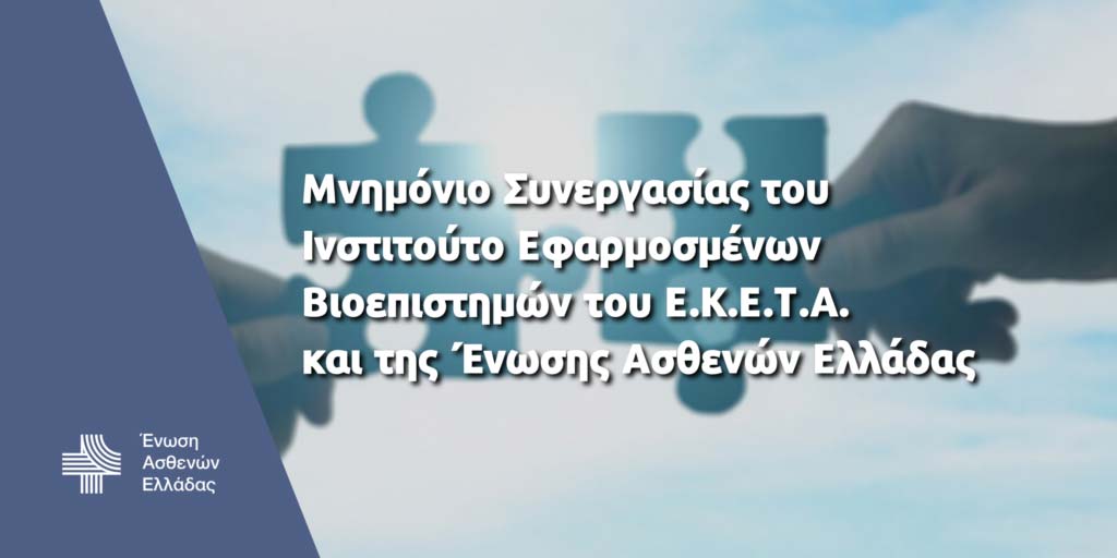 Το Ινστιτούτο Εφαρμοσμένων Βιοεπιστημών του Εθνικού Κέντρου Έρευνας και Τεχνολογικής Ανάπτυξης (ΙΝΕΒ | ΕΚΕΤΑ) και η Ένωση Ασθενών Ελλάδας επιβεβαίωσαν την κοινή στρατηγική για περαιτέρω ενδυνάμωση της συνεργασίας τους με την υπογραφή σχετικού Μνημονίου Συνεργασίας.