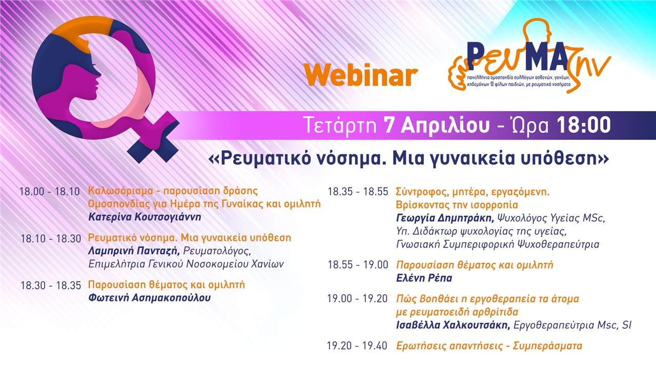 Η Πανελλήνια Ομοσπονδία Συλλόγων Ασθενών, Γονέων, Κηδεμόνων και Φίλων Παιδιών με Ρευματικά Νοσήματα ΡευΜΑζήν διαδικτυακό εκπαιδευτικό σεμινάριο την Τετάρτη 7 Απριλίου @ 18:00 – 19:30 με θέμα «Ρευματικό νόσημα. Μια γυναικεία υπόθεση».